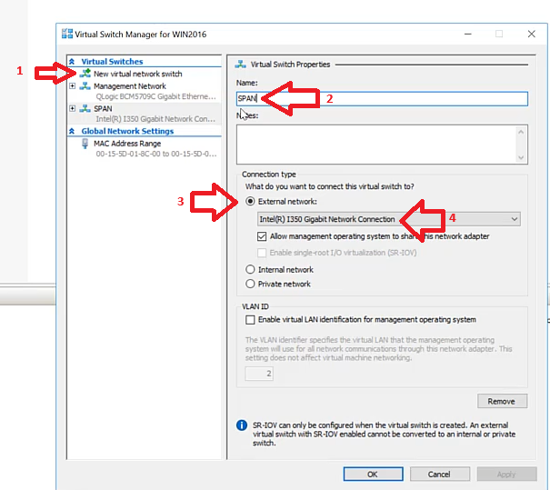 - Open to Hyper-V Manager and Open Virtual Switch Manager