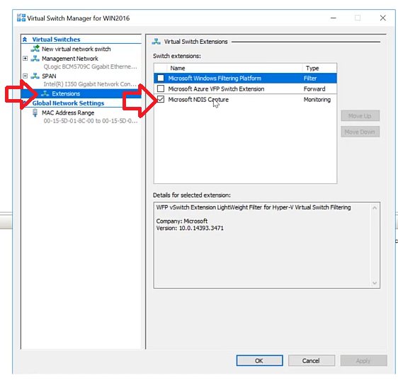- Next, go to Extensions and Enable Microsoft NDIS Capture