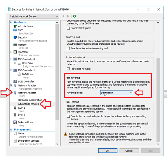 - Click on the adaptor connected to the SPAN virtual switch, go to advanced Features, in Port mirroring section select Mirroring mode as Destination.